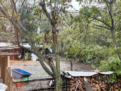 未明から降り出した雨 朝カーテン開けてみると馬は小屋の中であまやどり ん? 手前のクルミの木にエゾリスが居てるやん。 ずぶ濡れになりながら一···