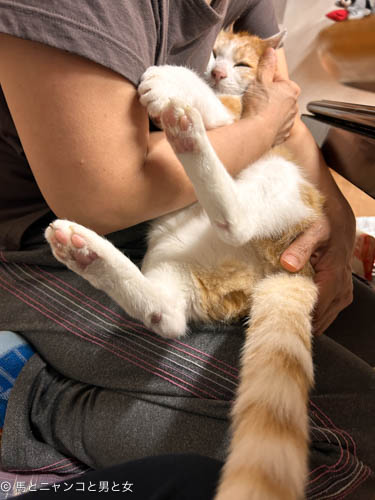 朝ごはん時 ゴロゴロとうるさいなぁ と横を見ると・・・ 朝からもう甘えてる「まっちゃん」。 幸せそうな顔してはるけどさっき起きたばっかやぞ···