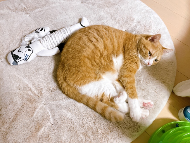 またたび粉をつけたストーム・トルーパーに ふかふかで添い寝をするユウ。気に入りましたか、そーですか。(*´ω`*)添い寝終了?PCに向かっていたらす···