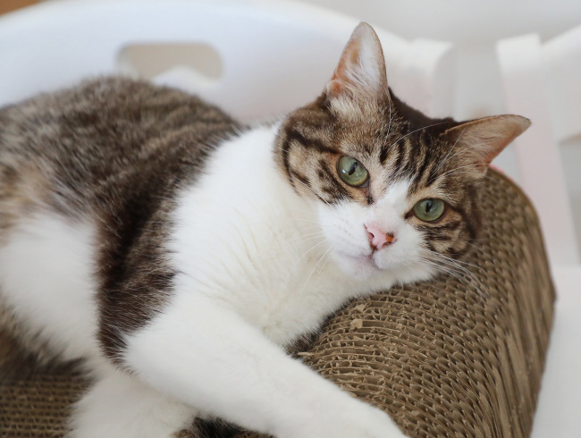 爪とぎソファに寝そべって なでなでされていたアミ姐さんのお耳がぴくりぴくりと微かに反応。カーテンの向こうからひっそりと 熱い視線を送っているユ···