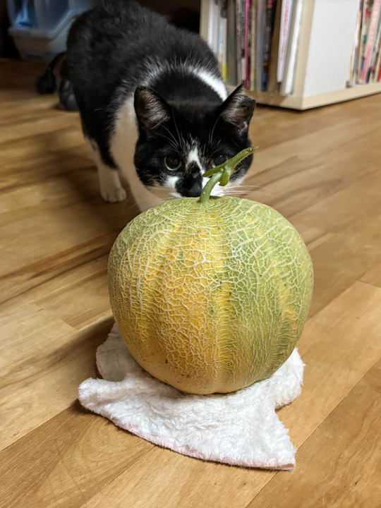 甘い匂いに誘われ自家製メロンに近づくマーボー。誰かがメロンの苗をスイカの棚に戻しよったんでしょうな よく見ずに手にしたちこ太郎。 でもスイ···