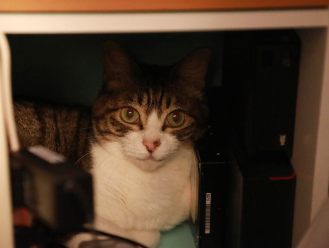 キャリーやソファまわりなどのよくいる寝床にユウの姿がないと思ったらユウの大好きなサーキュレーターの 裏側から出てきましたよ。サーキュレーター···