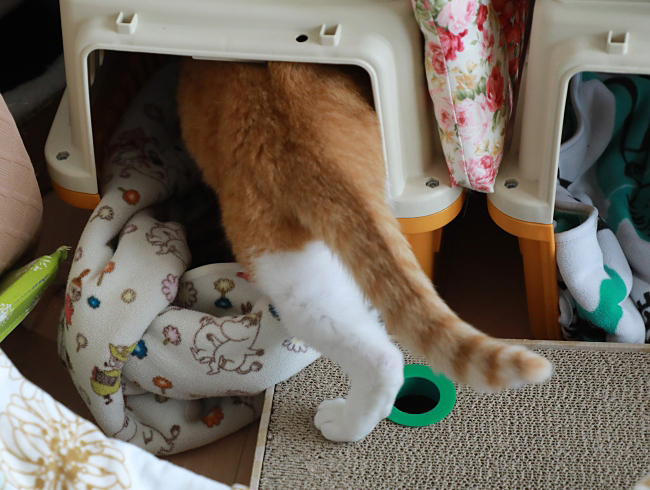 お下がりキャリーの中に たたんで入れた毛布をユウがせっせとほりほり。猫らの愛用しているリバーシブルの毛布を フリース面を外側にして入れてあった···