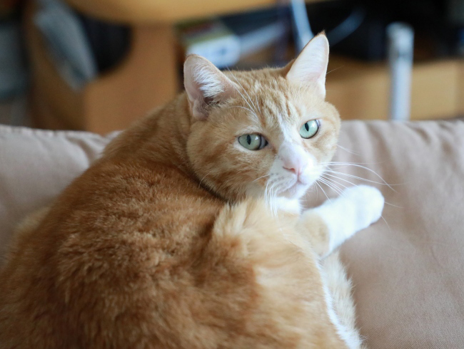 ソファの座布団をもっとアミ姐さんが使って ニオイをつけてくれたらいいのにと思っているふうなユウですがエアコンの涼風嫌いの姐さんは暑い寝室のさ···