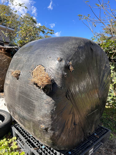 昨日の朝 馬の世話をしに外へ出たらラップされた予備の牧草が飛び出してた。 はて 前日の夜 横を通った時はこうはなってなかったはず。 これ な···