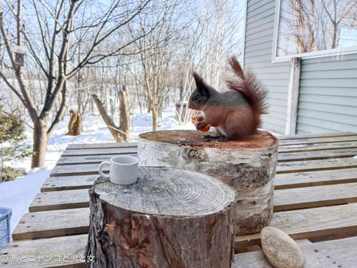 をっ! 野鳥食堂にエゾリス。 鳥が食べ残したミカンの皮食べとる。 こんなもんまで食べるとは 無駄がないなぁ。「早くどっか行ってくれないか···