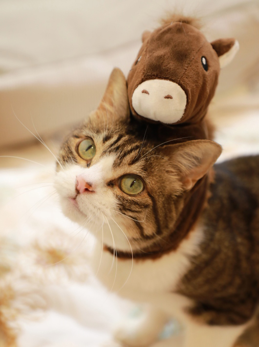 あけましておめでとうございます正面からだとよくわかりませんがお馬さんのかぶりものですよ。かぶる子も、かぶらない子もただ元気でいてくれたらそれ···
